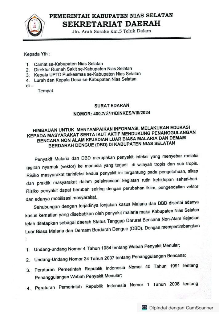DANDIM 0213/NIAS PIMPIN APEL TIM TERPADU PENANGANAN BENCANA KLB MALARIA DAN DBD KAB. NIAS SELATAN