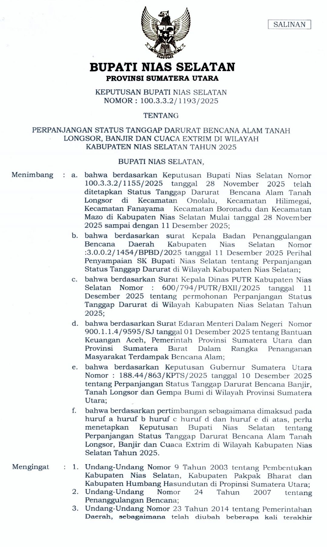PERPANJANGAN STATUS TANGGAP DARURAT BENCANA ALAM TANAH LONGSOR, BANJIR, DAN CUACA EXTRIM DIWILAYAH KABUPATEN NIAS...