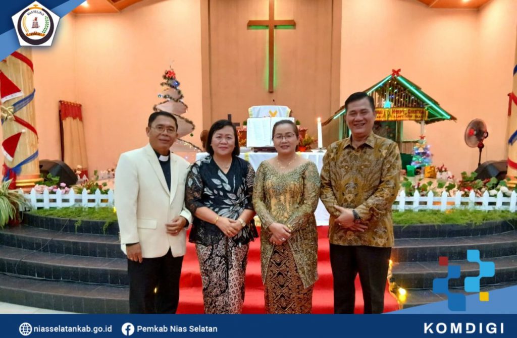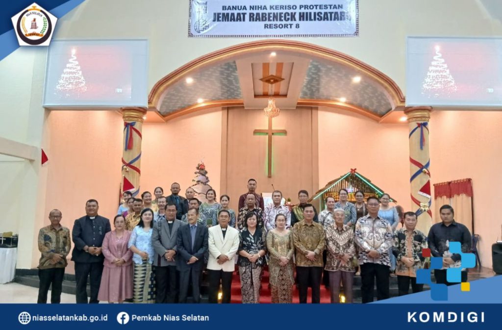 Bupati Nias Selatan Sokhiatulo Laia bersama Ny. Militina Sokhiatulo Laia, menghadiri ibadah bersama pada Perayaan Natal Umum BNKP Jemaat Bebeneck Hilisataro Resort 8, di Gedung Gereja BNKP Rebeneck – Hilisataro, Minggu (28/12/2025).
