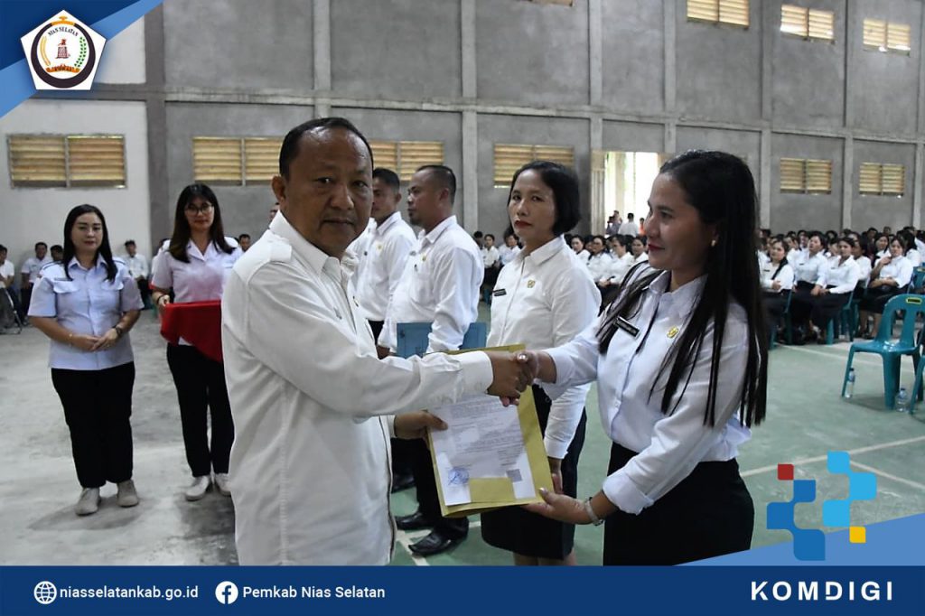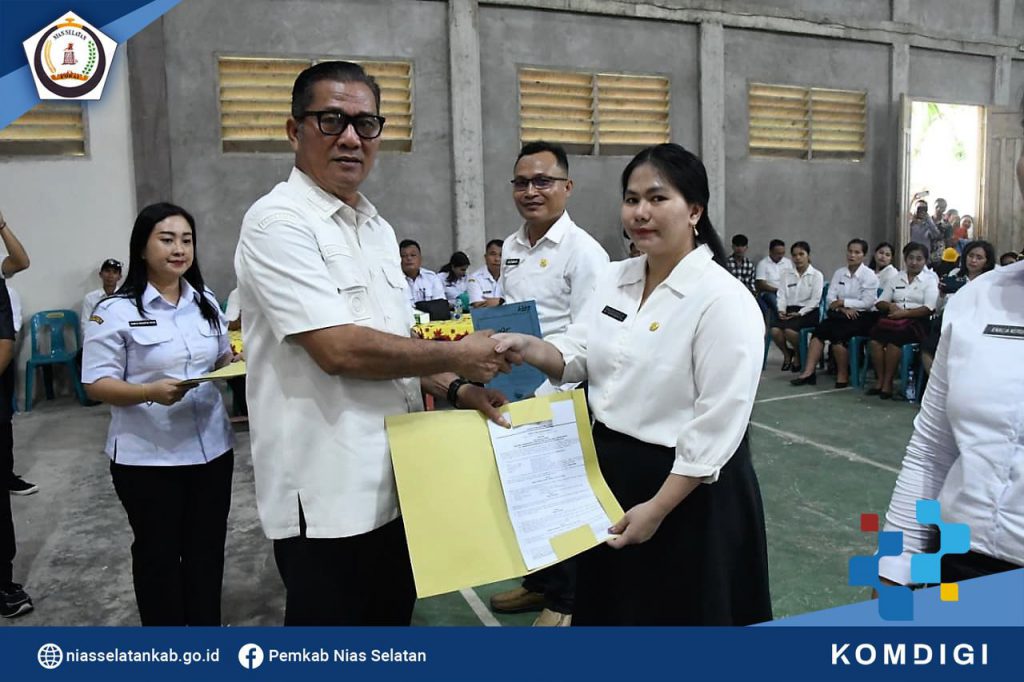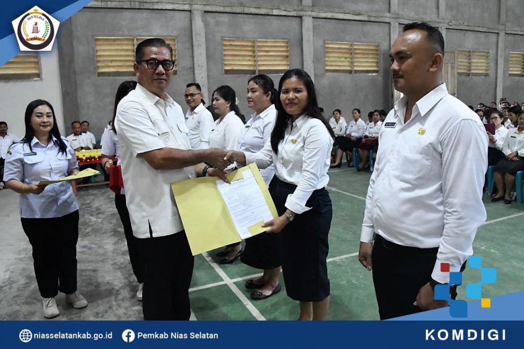 Bupati Nias Selatan Sokhiatulo Laia, menyerahkan Surat Keputusan (SK) pengangkatan kepada 550 orang penerima SK PPPK Paruh Waktu di wilayah kerja Kecamatan Lahusa, Kecamatan Somambawa dan Siduaori, yang digelar di GOR Desa Bawootalua Kecamatan Lahusa, Rabu (28/01/2026).