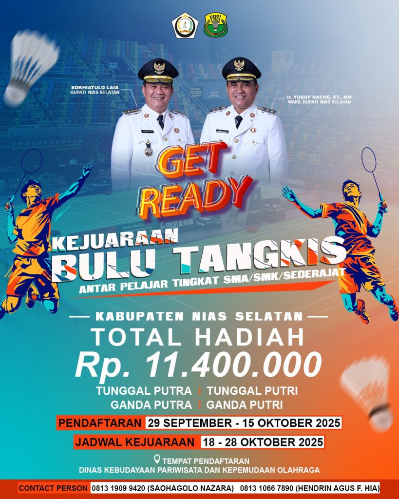 Dalam rangka memperingati Hari Sumpah Pemuda ke-97 Tahun 2025, Pemerintah Kabupaten Nias Selatan melalui Dinas Kebudayaan Pariwisata dan Kepemudaan Olahraga Kabupaten Nias Selatan bekerja sama dengan Pengurus Persatuan Bulu Tangkis Seluruh Indonesia (PBSI) Kabupaten Nias Selatan mengadakan Kejuaraan Bulu Tangkis Antar Pelajar SMA/SMK/Sederajat di Kabupaten Nias Selatan Tahun 2025