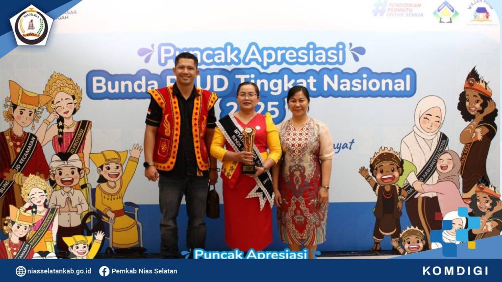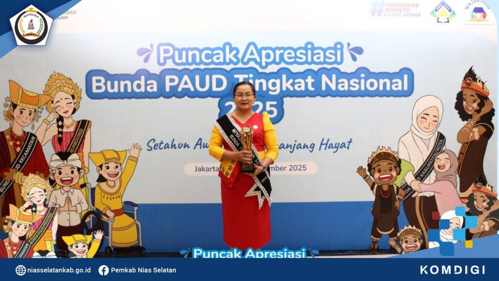 Nias Selatan – Dinas Kominfo ; Bunda PAUD Kabupaten Nias Selatan Militina Sokhiatulo Laia, meraih Penghargaan Apresiasi Bunda PAUD Tingkat Nasional yang diserahkan langsung oleh Bunda PAUD Nasional Selvi Gibran Rakabuming Raka pada puncak Apresiasi Bunda PAUD se-Indonesia , yang dilaksanakan di Hotel Sultan Jakarta. (Kamis, 13/11/2025).