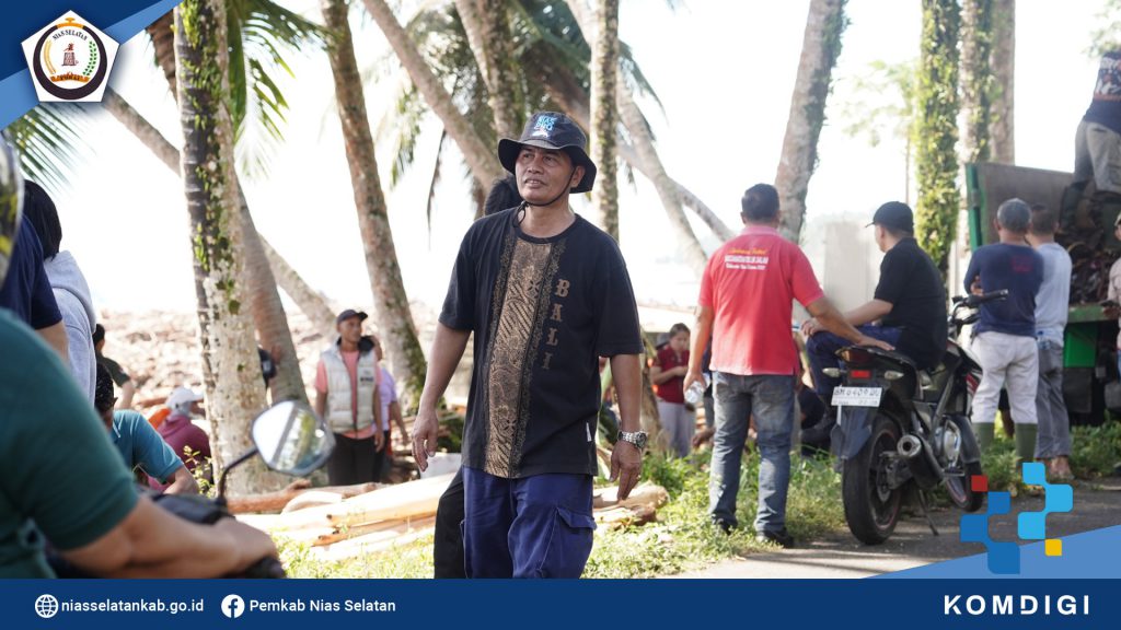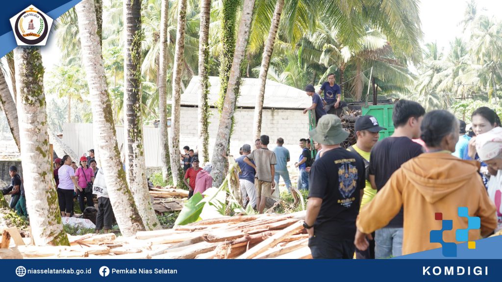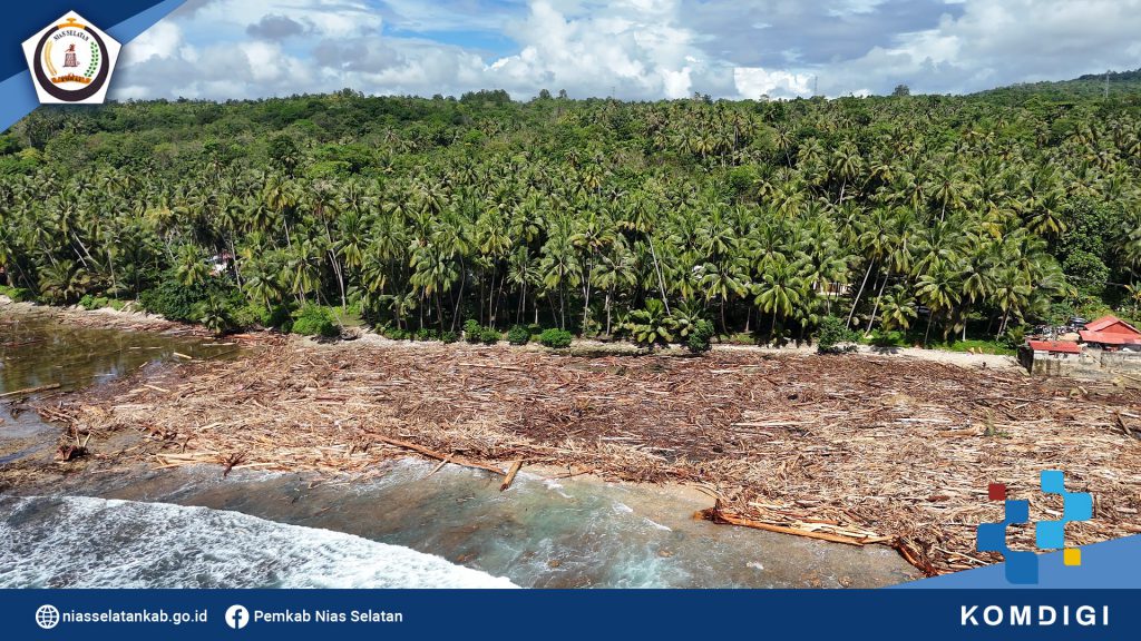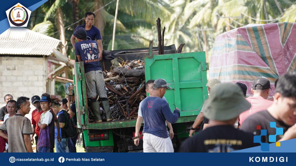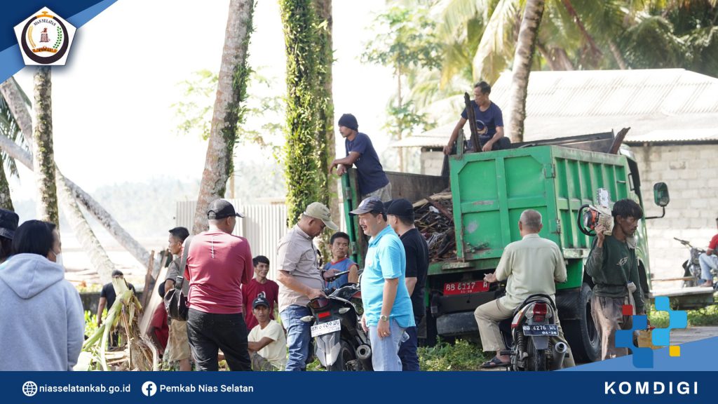 Pemerintah Kabupaten Nias Selatan melaksanakan gotong royong bersama , untuk membersihkan tumpukan gelondongan kayu pasca bencana banjir dan longsor Tapunuli Tengah, di sepanjang pantai Bawozaua (Batu Atola) Desa Bawozaua Kecamatan Teluk Dalam. (Jumat, 06/12/2025).