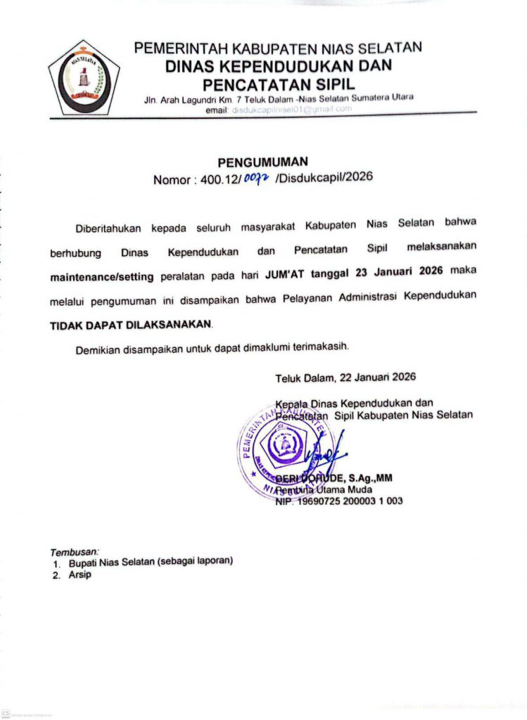 PENGUMUMANOleh Admin_Diskominfo / 26 Januari 2026 Pelayanan Administrasi Kependudukan di Dinas Dukcapil Kab. Nias Selatan.