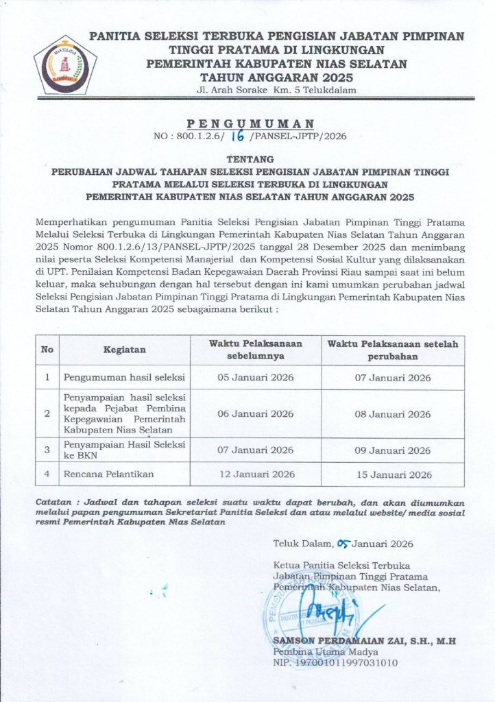 PERUBAHAN JADWAL TAHAPAN SELEKSI PENGISIAN JABATAN PIMPINAN TINGGI PRATAMA MELALUI SELEKSI TERBUKA DI LINGKUNGAN PEMERINTAH KABUPATEN NIAS SELATAN TAHUN ANGGARAN 2025Oleh Admin_Diskominfo / 6 Januari 2026