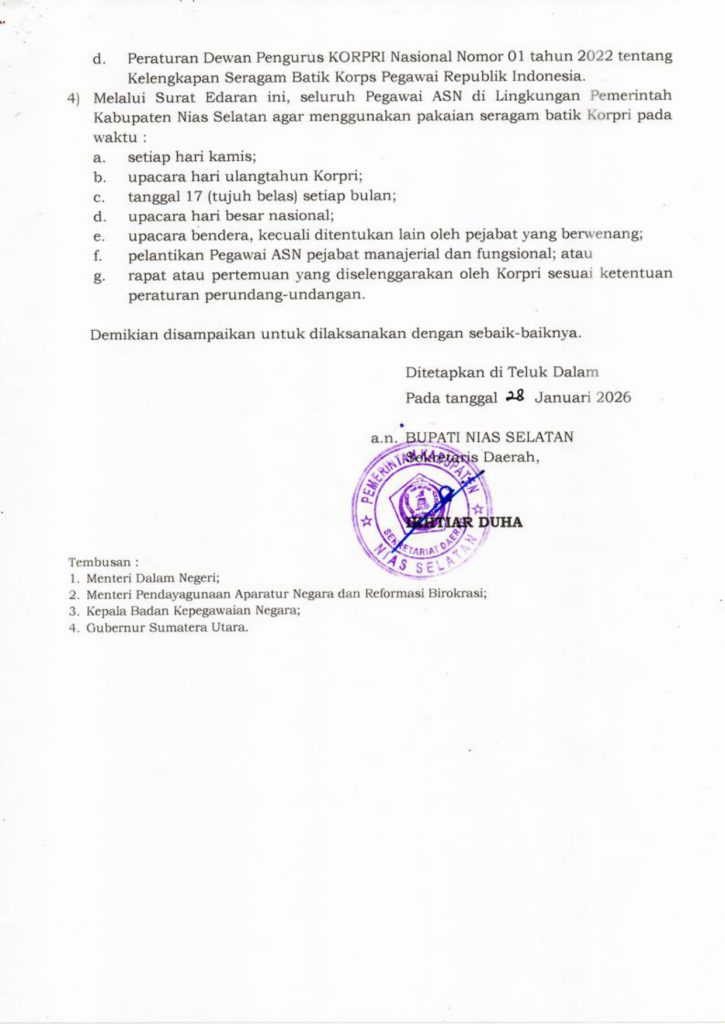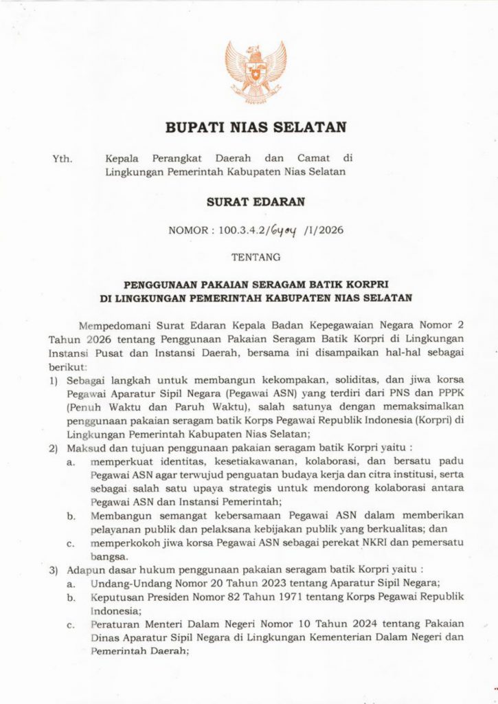 SURAT EDARAN BUPATI NIAS SELATAN TENTANG PENGGUANAAN SERAGAM BATIK KORPRI TAHUN 2026Oleh Admin_Diskominfo / 2 Februari 2026