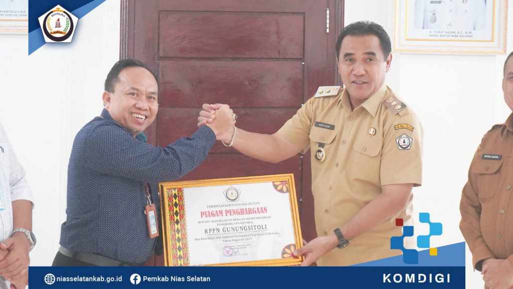 Wakil Bupati Nias Selatan Ir. Yusuf Nache, S.T., M.M. menerima Plt. Kepala KPPN Gusit Bagong Iswanto, sekaligus pemberian Piagam Penghargaan dari Pemerintah Kabupaten Nias Selatan Kepada KPPN Gunungsitoli atas koordinasi dan asistensi percepatan penyaluran DAK Fisik TA 2025, Bertempat di Ruang Kerja Wakil Bupati Nias Selatan. Jl. Arah Sorake Km.5, (Selasa, 18/11/ 2025).